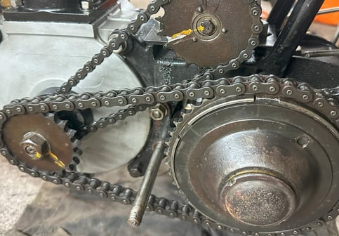 Angetrieben wird der Magnetzünder an unseren Maschinen über eine extra kleine Kette, welche im Verhältnis 2:1 die Kurbelwelle Umdrehungen verfolgt und somit genau im richtigen Takt einen Zündfunken erzeugt.