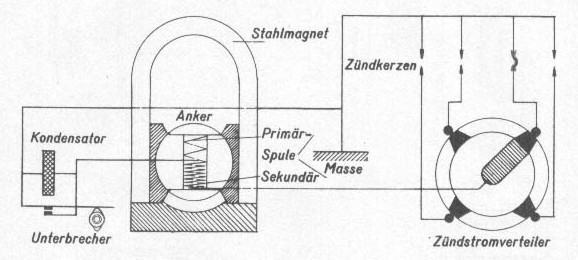 Ein Unterbrechermechanismus, der von einem Nocken auf der Welle des Generators betätigt wird, unterbricht den Stromkreis zum Zündzeitpunkt. Da die Spule eine Induktivität ist, die die Eigenschaft hat, den Strom nach Unterbrechung des Stromkreises weiter fließen zu lassen, entsteht an den geöffneten Kontakten des Unterbrechermechanismus kurzzeitig eine hohe Spannung, die sich in einem Funken entlädt. Die höchste Effizienz wird dann erreicht, wenn der Kontakt bei der Winkelstellung des größten magnetischen Flusses schließt und der Zündzeitpunkt (Öffnen des Kontaktes) bei derjenigen Winkelstellung liegt, wo kein externes Magnetfeld auf die Spule wirkt (sog. efficiency gap). Der Unterbrecherkontakt ist im Magnetzünder an der rotierenden Achse untergebracht und wird durch eine rotierende Nocke betätigt. Die erzeugte elektrische Energie wird über das einzige Kabel an unseren Motorrädern an die Zündkerze direkt im Zylinder abgegeben. Es entsteht ein Zündfunke an der Zündkerze. Der Zündzeitpunkt wird durch die Winkelposition des Unterbrechers bestimmt, die Spannung für die Zündkerze wird bei den ersten Modellen über Schleifringe abgenommen. Um die störanfälligen Schleifringe zu vermeiden, ist bei späteren und heutigen Bauformen die Spule stationär und die Dauermagnete drehen sich um die Spule (unsere Magnetzünder arbeiten noch mit Schleiferkontakten -> alte Bauform).
