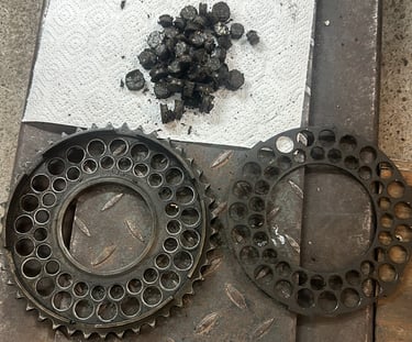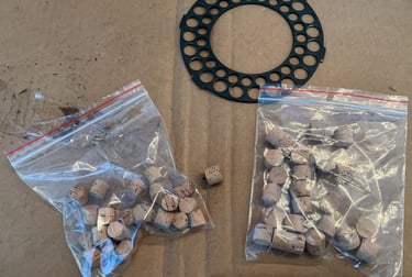 Sind alle Korken verbaut und erkaltet, dann sitzen die neuen Korken als frische Beläge sehr fest in den Lochscheiben . Für eine bessere Kontaktfläche und rupffreies Kuppeln werden die Korken in den Scheiben mittels großem Bandschleifer auf gleiche Höhe geschliffen.