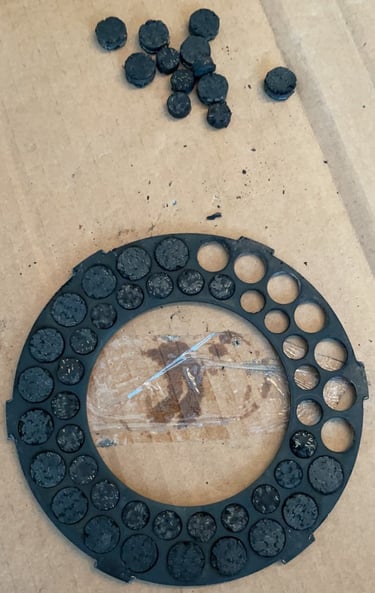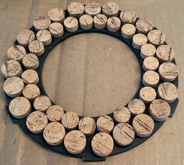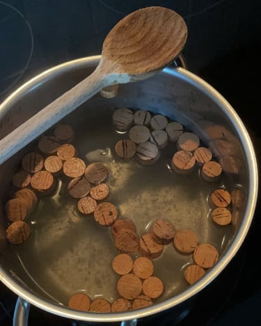 Hierzu müssen die Korken erstmal ordentlich weich gekocht werden. Dadurch wird der Kork wie sehr weicher Gummi und lässt sich ideal verarbeiten. Die Korken haben deutliches Übermaß und werden in die Löcher der Scheiben geklemmt. Die geht nur wenn die Korken sehr stark weich gekocht sind.