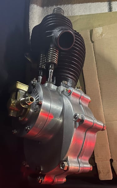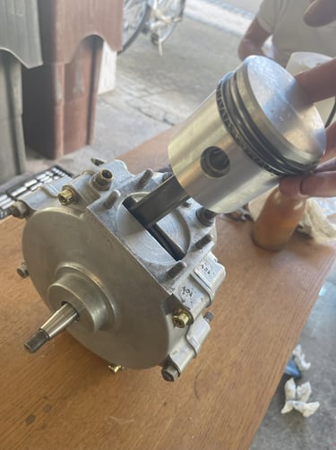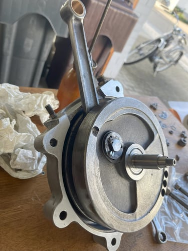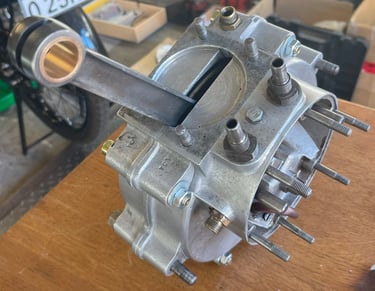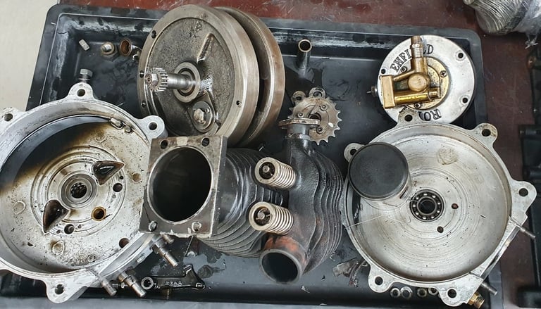 Ein großes Problem war einen Ersatz zu finden. Nach langer Recherche wurde ein passendes Gleichteil dank Internet in England gefunden. Allerdings musste die Kurbelwelle komplett neu aufgebaut werden. Neuer Pleuelbolzen, angleichen und auswuchten der beiden Kurbelwellenwangen und Rundlauf sicherstellen. Das Pleuel wurde ebenfalls komplett überarbeitet. Neue Lagerung zur Kurbelwelle und neue Lagerung für den Kolben. Ein neuer Kolbenbolzen musste ebenfalls angefertigt werden. Aufgrund des Verschleiß am Kolben und Zylinder wurde ebenfalls ein Übermaßkolben nach dem Original angefertigt.