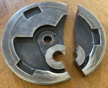 Das eigentliche Problem stellte sich allerdings erst nach einer genauen Inspektion heraus. Die Kurbelwelle hatte einen Haarriss in einem der beiden Schwungräder, wodurch der Pleuelzapfen nicht mehr richtig fest war. Durch die Verschraubung konnte die Kurbelwelle zwar nicht auseinanderfliegen, allerdings hat sich der Pleuelzapfen in der Kurbelwange drehen lassen und somit konnte sich die Kurbelwelle ineinander verdrehen. Durch dieses Problem verdrehte sich die Kurbelwelle unter Last, womit die Geometrie nicht mehr stimmte und verkeilt. Die Kurbelwelle eierte im Gehäuse und berührte sogar die Innenwand. Folglich eierte ebenfalls der Ausgangswelle der Kurbelwelle, wodurch die Ketten ständig gespannt und entspannt wurden.
